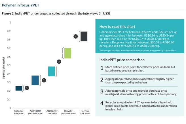 印度、東南亞的廢塑料原料和再生塑料價格缺乏透明度,導致需求和供應波動,再生設施產(chǎn)能利用率低,最終對品牌商履行其塑料包裝中再生材料承諾構(gòu)成挑戰(zhàn)。 價格數(shù)據(jù)至關(guān)重要,在缺乏數(shù)據(jù)的情況下,品牌商和其他再生塑料買家設定的目標將脫離市場。